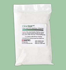 Citric acid from RPC is also flexible. It allows mixing to the most effective concentration (typically 5% - 50%). Concentration with commercial pre-mixed liquid solutions is fixed. Citric acid is excellent for other purposes also, such as removing corrosion from stainless steel parts or dried dialysate from plastic parts.